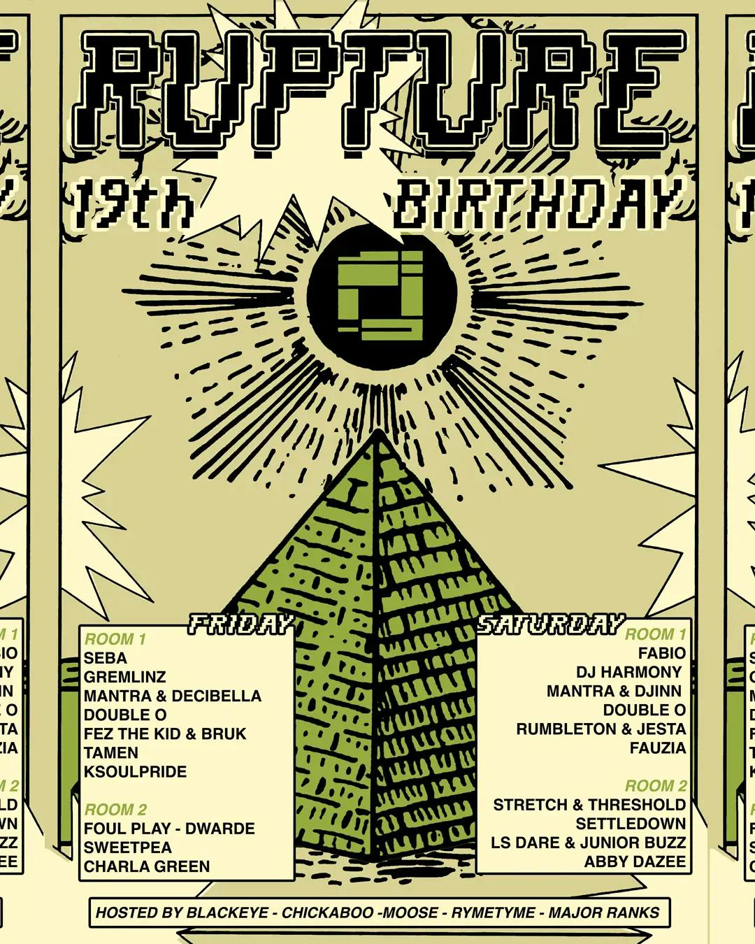 Celebrating 19 years of Rupture at our beloved Corsica Studios! Over the weekend we’ll be celebrating all the sacred corners of jungle, d&b and hardcore. We’re so excited to rave one e again with our beautiful Rupture community - come join us!