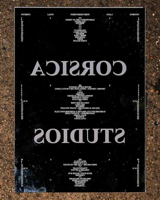Unveiling the Corsica Studios closing series: three months of hand-picked events celebrating our influences and saluting the people, artists, and promoters who have shaped Corsica over the past two and a half decades.